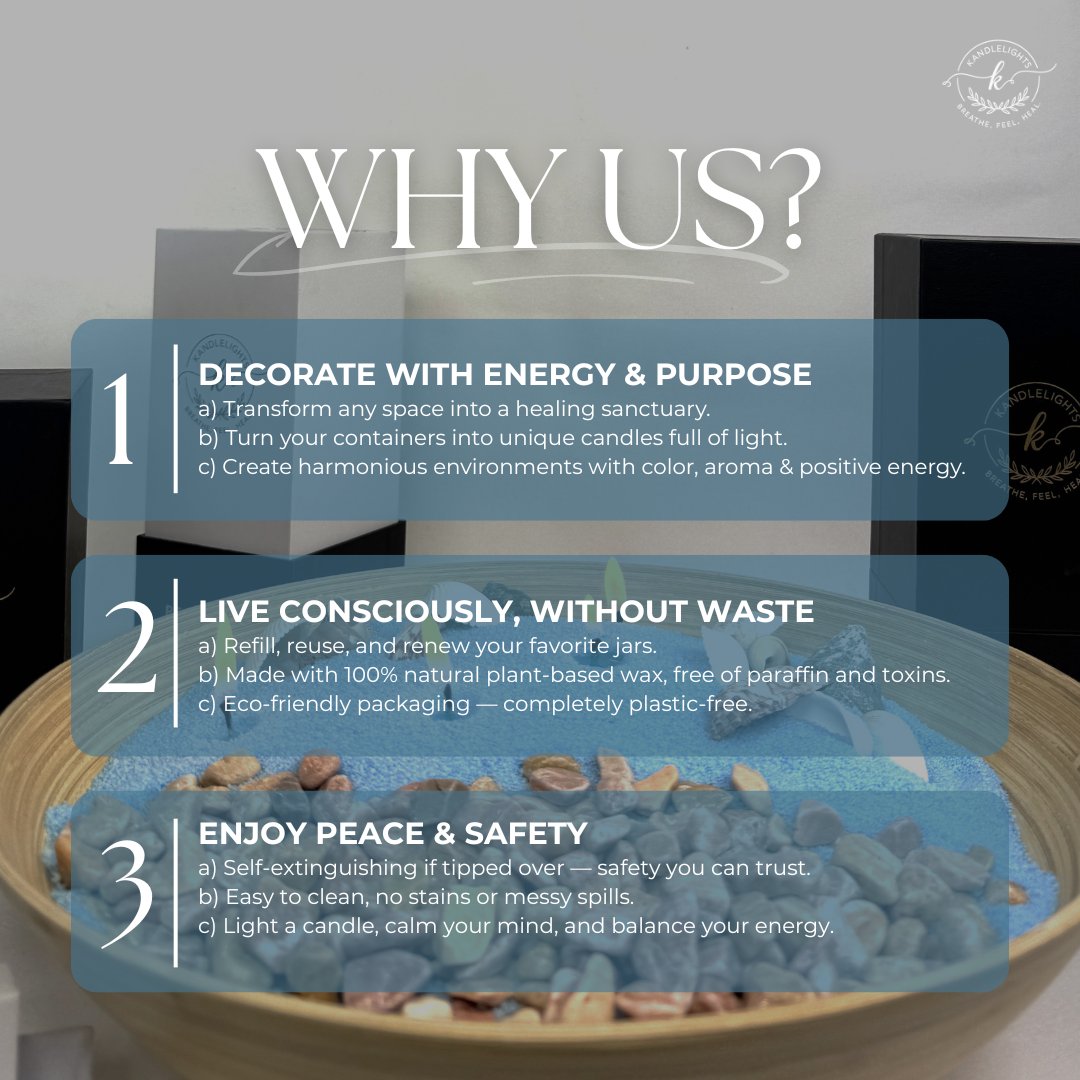 Kandlelights are crafted with pearled sand vegetable wax, 100% vegan, eco-friendly, and clean-burning. More than candles, they are tools of healing and wellness, designed to calm the mind, restore balance, and transform your space.