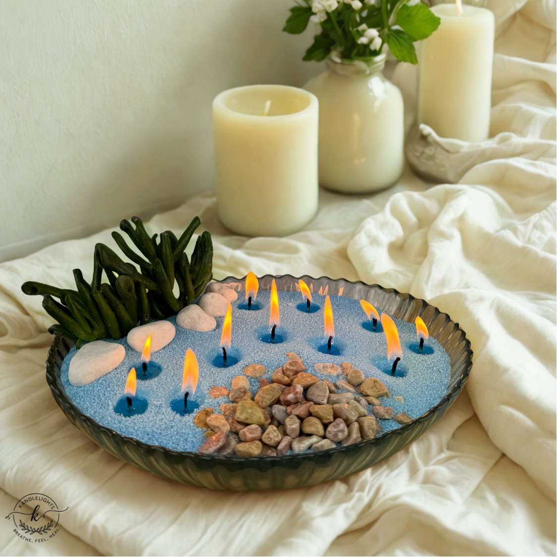 “Illuminate your home and your soul: Kandlelights pearled sand candles combine healing and style. Decorate them as you wish and let their energy transform your day.”