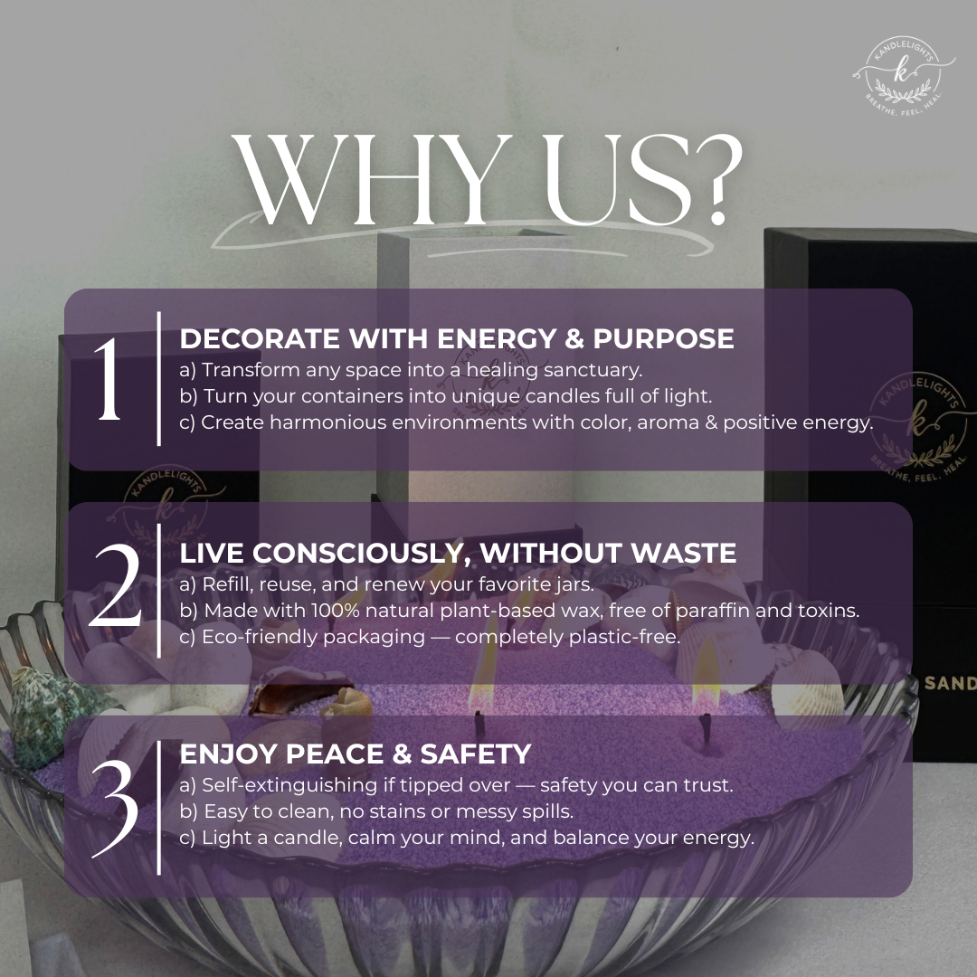 Kandlelights are crafted with pearled sand vegetable wax, 100% vegan, eco-friendly, and clean-burning. More than candles, they are tools of healing and wellness, designed to calm the mind, restore balance, and transform your space.