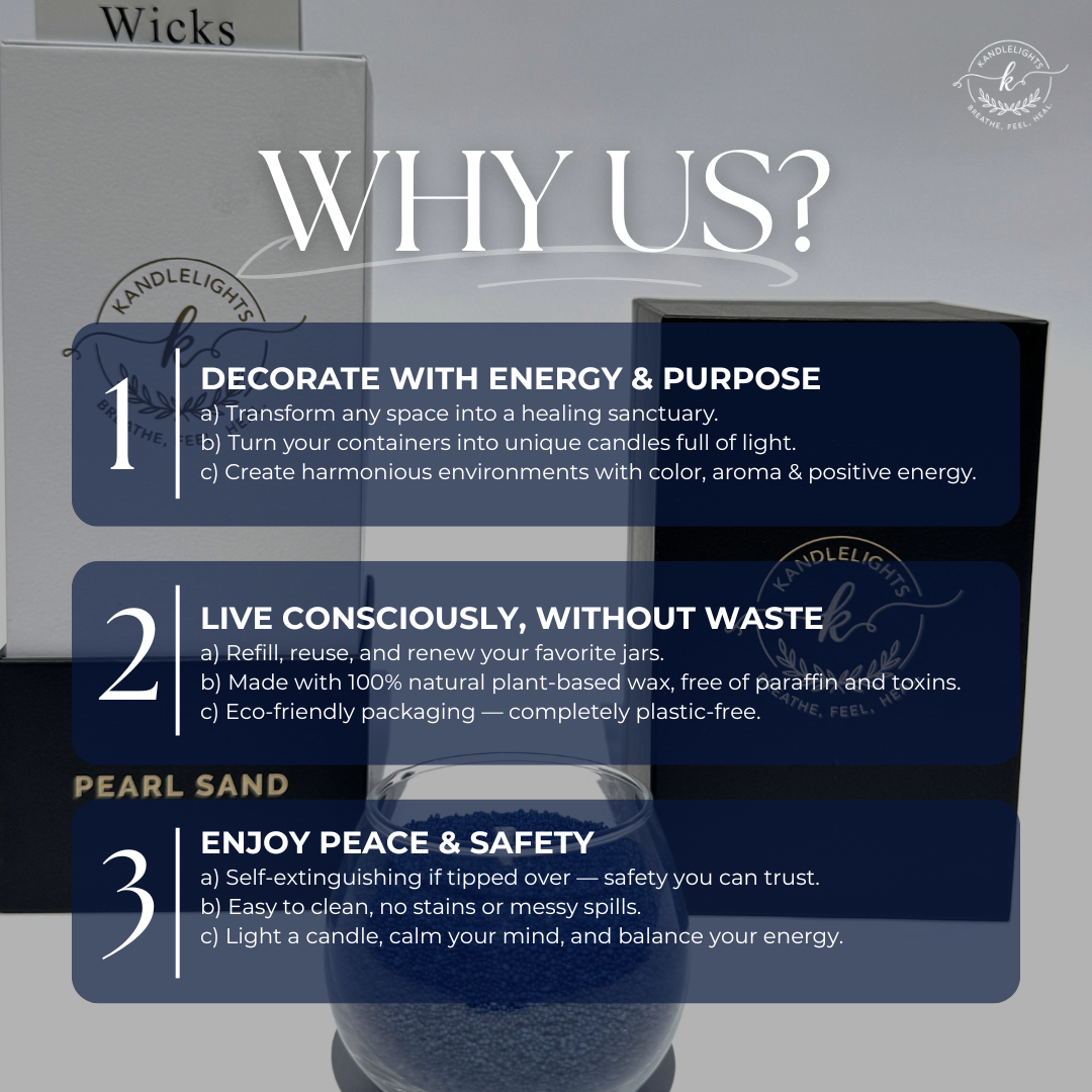 Kandlelights are crafted with pearled sand vegetable wax, 100% vegan, eco-friendly, and clean-burning. More than candles, they are tools of healing and wellness, designed to calm the mind, restore balance, and transform your space.