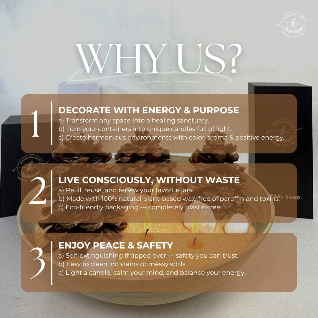 Kandlelights are crafted with pearled sand vegetable wax, 100% vegan, eco-friendly, and clean-burning. More than candles, they are tools of healing and wellness, designed to calm the mind, restore balance, and transform your space.
